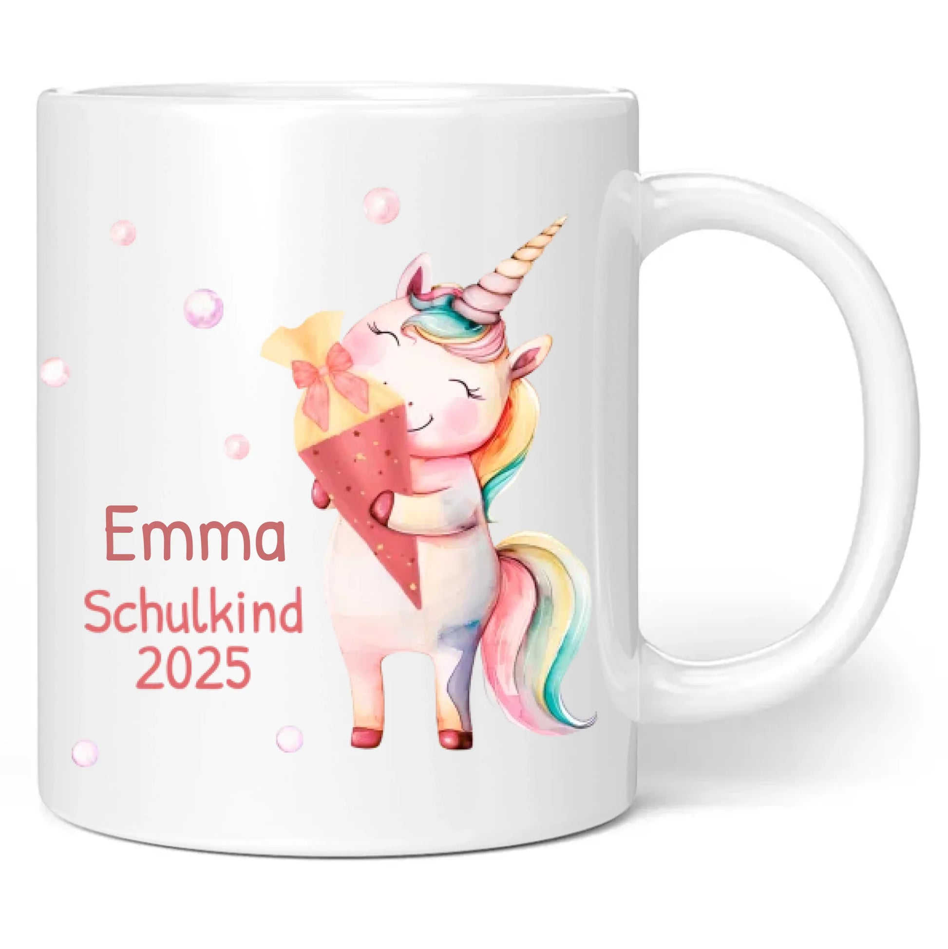 Tasse "Schulkind 2025" (Einhorn mit Schultüte) personalisiert mit eigenem Namen